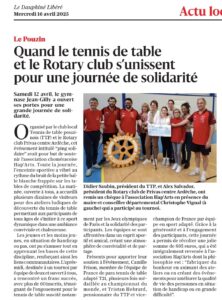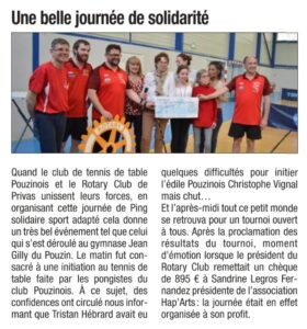 L’accompagnement de Tristan Hebrard : Notre adhésion à la FFSA, c’est aussi le souhait de permettre un meilleur suivi de Tristan Hebrard dans ses compétitions spécifiques. Tristan évoluant notamment, au niveau national dans la FFSA, le club souhaiterait continuer à l’accompagner dans son ascension en lui permettant de bénéficier de toutes les compétences humaines, matérielles et financières, afin qu’il performe au plus haut niveau, sous les couleurs du Tennis de Table Pouzinois. A ce titre, le club souhaiterait proposer un créneau d’accueil, spécifiquement pour le sport adapté, sous la direction de l’entraîneur du Comité Drôme Ardèche de Tennis de Table (CDATT), Fabrice Gaillard, diplômé d’état. D’autre part, le club porte un nouveau projet, d’organiser une ou plusieurs manifestations dédiées au sport adapté en lien avec le Comité Drôme Ardèche de Tennis de Table, le Comité Départemental de Sport Adapté, ainsi que des associations locales comme par exemple le Rotary club de Privas. Enfin, le club est actuellement en réflexion sur le recrutement d’un encadrant BPJEPS ou STAPS pour animer de séances hebdomadaires ou mensuelles en cas de nouvelles licences en sport adapté.