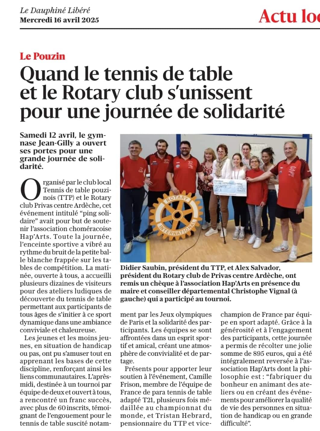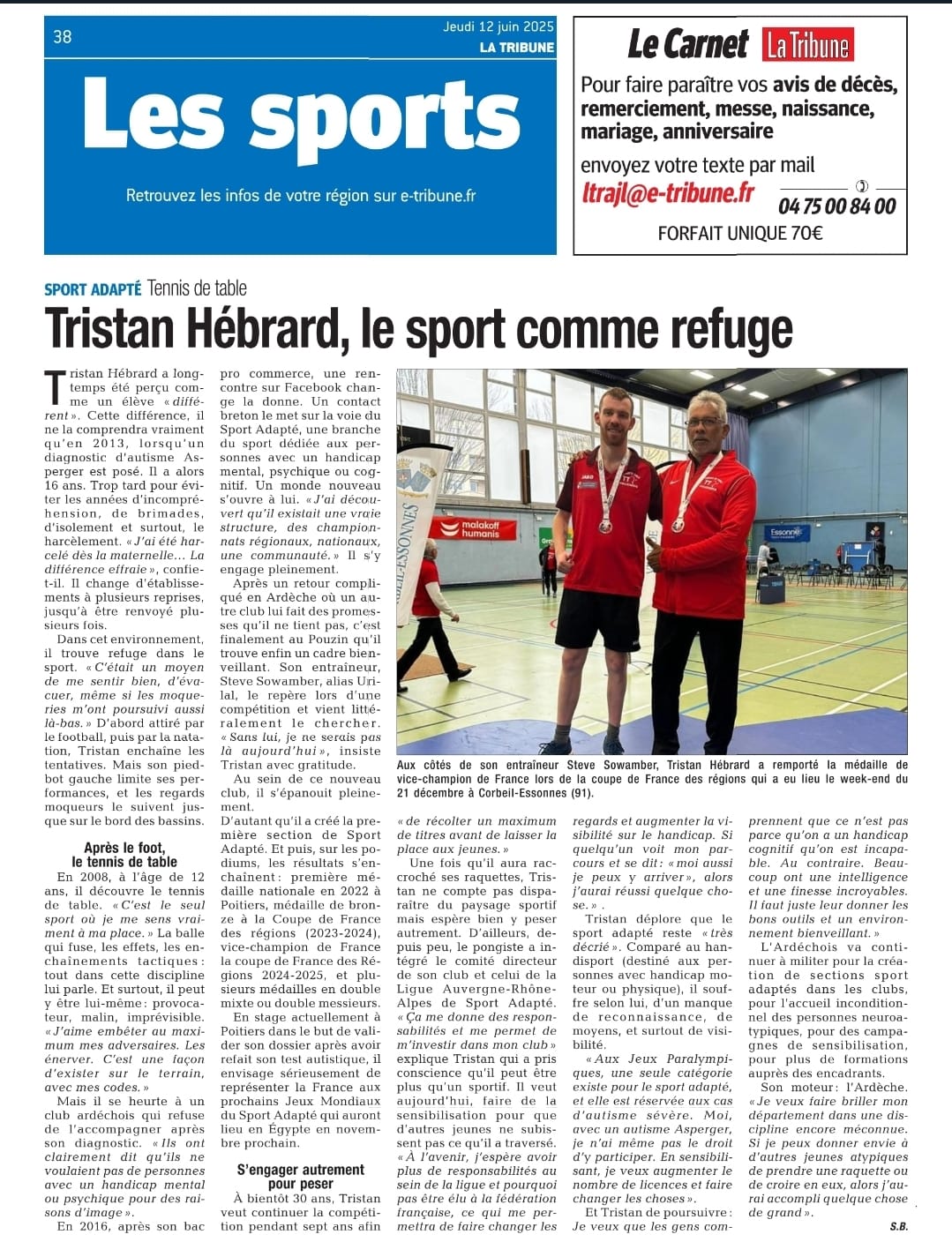 Mot de Tristan Hebrard, le 22 septembre 2024 : Bonjour je m’appelle Tristan Hebrard, j’ai 27 ans et je suis autiste asperger*. Je pratique le tennis de table depuis 2008 et je fais parti du club du Pouzin depuis 2022. Je fais également du sport adapté depuis 2017 et grâce à un accompagnement, j’ai un petit palmarès : Double champion Auvergne Rhône Alpes, trois autres médailles régionales. et quatre médailles de bronze aux championnats de France dans la catégorie « CD », en tennis de table.